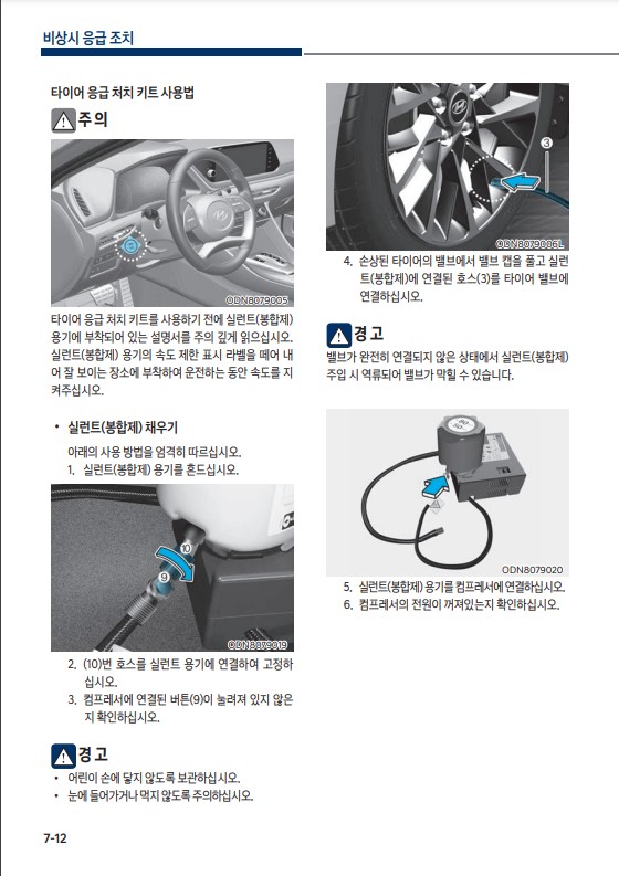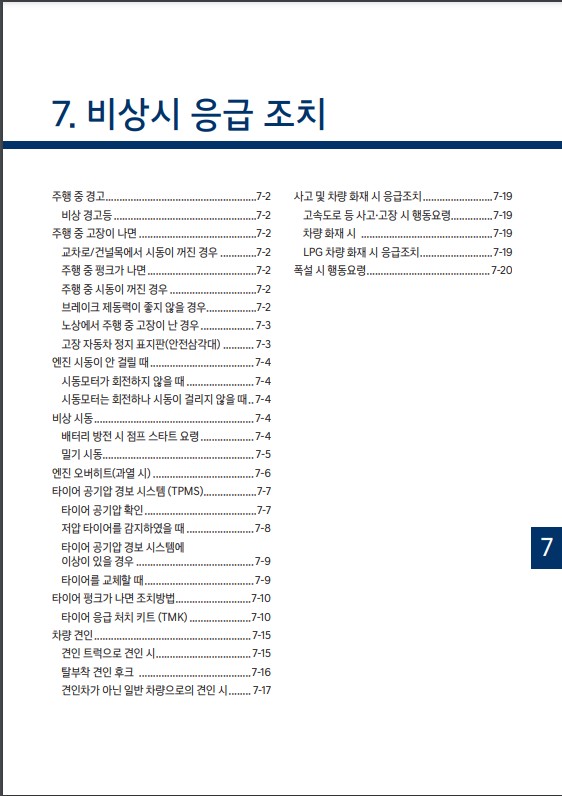 취급설명서가 가장 필요할 때가 갑작스럽게 자동차에 문제가 생겼을 경우일 것이다. 사진에서 보이는 목차와 같이 비상상황별로 어떤 경고로 알려주는지, 어떻게 해결해야 하는지 알려주고있다. 목차 오른쪽 사진의 경우 타이어가 펑크났을 때 사용할수 있는 타이어 응급처치 키트 사용법에 대한 설명의 일부다. 이 외에도 시동이 꺼졌을 때, 견인을 해야하는 경우 올바른 예시 등 다양한 상황에서의 행동 요령을 찾아 볼 수 있다.