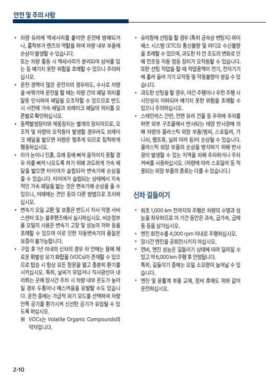 자동차 관리시 또는 이용하면서 지켜야 할 안전사항에 대해 간략히 정리해 놓은 내용이다. 마지막 부분에는 신차 길들이기에 대해 설명되어 있는데 최초 1,000km 전까지의 주행은 차량의 수명과 성능을 좌우하기 때문에 이 기간 동안은 급 가속 급 제동 등은 삼가 하는 게 좋다고 한다. 또 연비, 엔진의 성능은 신차 길들이기 상태에 따라 달라질 수 있으며 약 6,000km 주행 수 안정이 된다고 한다.