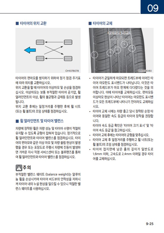 그 다음으로는 자동차 점검시 해야 항목들을 이미지와 함께 어떻게 점검해야 하는지, 어떤 점을 주의해야 하는지 자세히 설명해 두었다. 위의 참고 이미지는 엔진오일양을 점검하고 보충하는 설명의 일부 페이지와 타이어 교체 시기 확인과 위치교환에 대한 설명의 일부 페이지다.