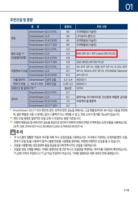위의 이미지에서 엔진오일 항목을 보면 4.8L의 용량을 사용해야 하고, SAE 0W-20, SN PLUS/SP 또는 ILSAC SF-6 이라고 표시되어있다.