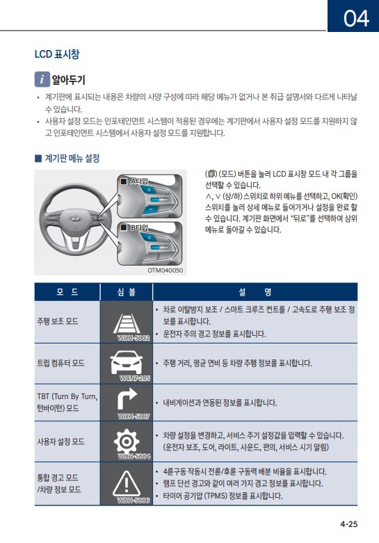 자동차 계기판에 대한 정보가 정리되어있다. 계기판에는 수만은 정보 및 경고가 그림과 색으로 표시가 되기 때문에 미리 알아두지 않으면 운전중에 당황스러울 수 있다. 그런 경우를 대비해 사용중인 차량에서 사용되는 그림이나 경고 메세지에대해 어떤게 있는지 알아 볼 수 있고, 계기판 밝기 및 메뉴 설정 방법이 있어 운전자가 기호에 맞게 직접 설정을 할 수 있도록 정리해 두었다.
