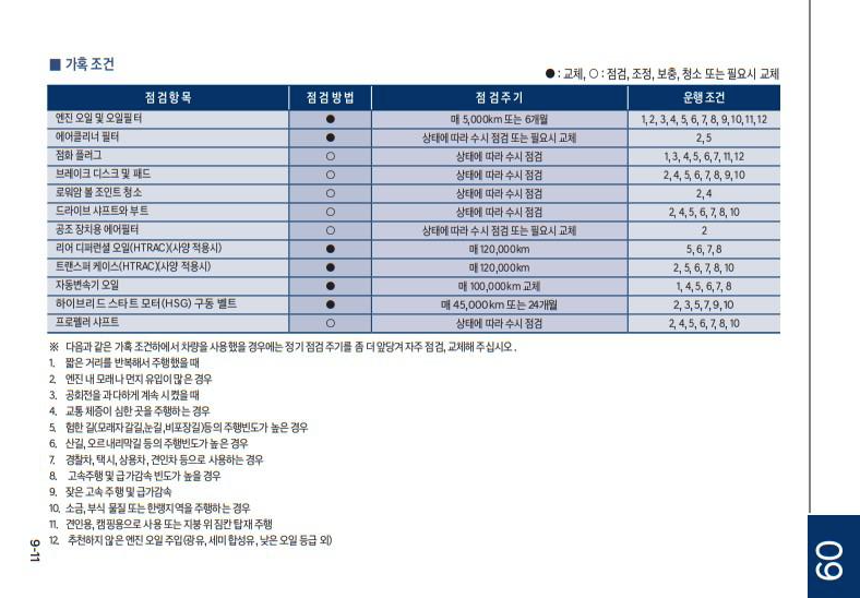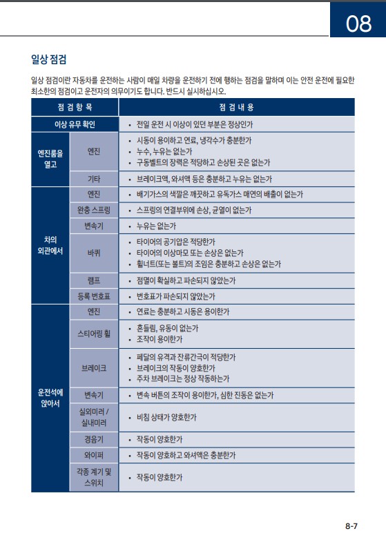안전 운행을 위해 자동차 관리에 항상 신경을 써야 하지만 바빠서 놓치는 부분이 있을 수도 있고, 옳은 방법이 아닌 경우가 있을 수도 있다. 이럴 때 정기 점검을 언제, 어떻게 해야 하는지 알려주는 항목이다.