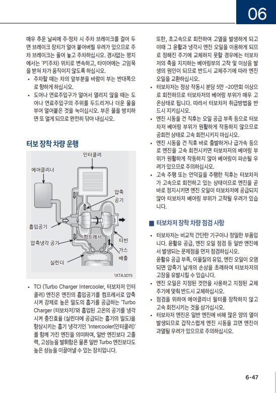 시동방법부터 주행에 필요한 정보들이 정리되어 있다. 운전하는 방법에 관한거라면 몸으로 익히면서 터득한 정보라 이정도는 이미 아는 뻔한 내용이지 않을까 하고 넘길 수 있지만 자세히 보면 바른 제동요령, 자동 정차기능, 터보장착 차량 운행시 등과 같은 세세한 정보들을 찾을 수 있고, 잘 알더라도 한번 더 내가 맞게 이용하고 있는지 확인하는 차원에서 점검해보면 좋을 것 같다.