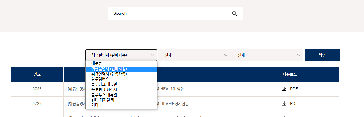 차량 종류와 모델이 다양하기 때문에 쉽게 찾을 수 있도록 카테고리를 나눠서 분류 검색 할 수 있게 되어있다.