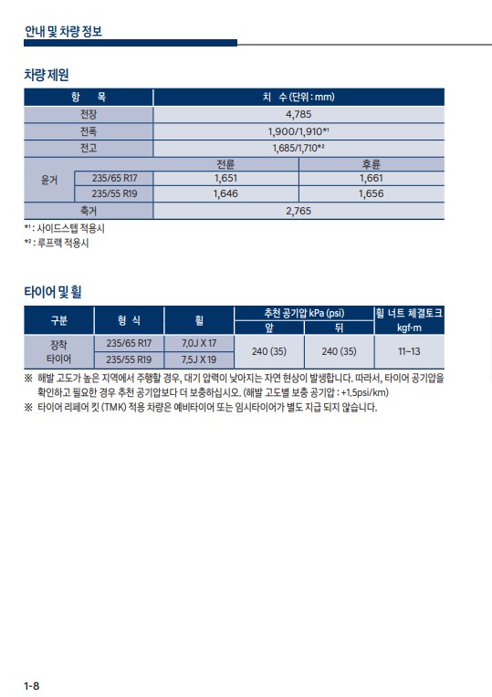마지막으로 차량에 대한 정보들을 알 수 있는 내용이 정리 되어 있다. 차량 외부와 내부의 각 부분 명칭에 대해 상세하게 정리되어있고, 차량 제원 및 사용 타이어에 대한 정보도 정리 되어있다.