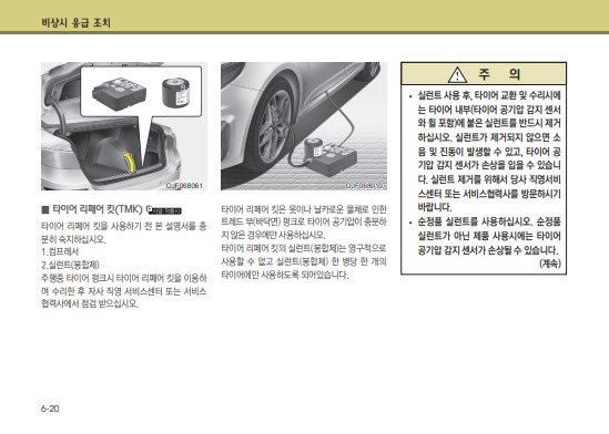 어쩌면 취급 설명서가 제일 생각나는 순간이 갑작스런 문제가 생겼을 때일 것이다. 위의 목차와 같이 시동이 안걸릴때, 타이어 리페어 킷을 사용 하는 매뉴얼, 견인을 해야 할 경우 등 여러가지 발생할 수 있는 비상상황에 대해 설명 되어져 있다.