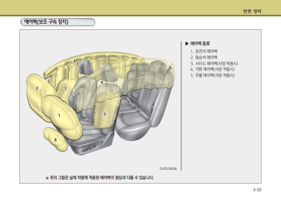 안전벨트, 에어백등과 같은 차량내 안전을 위한 장치들의 위치 및 명칭과 사용 매뉴얼, 주의사항에 대해 자세히 설명 되어있다.