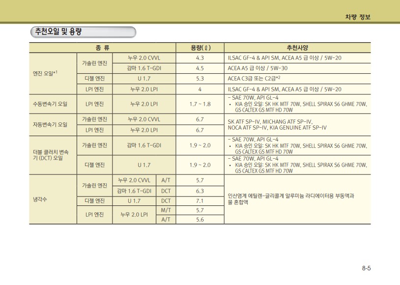 특히 여기서 가장 유용하게 쓰일 내용은 엔진오일 추천 및 용량이다.