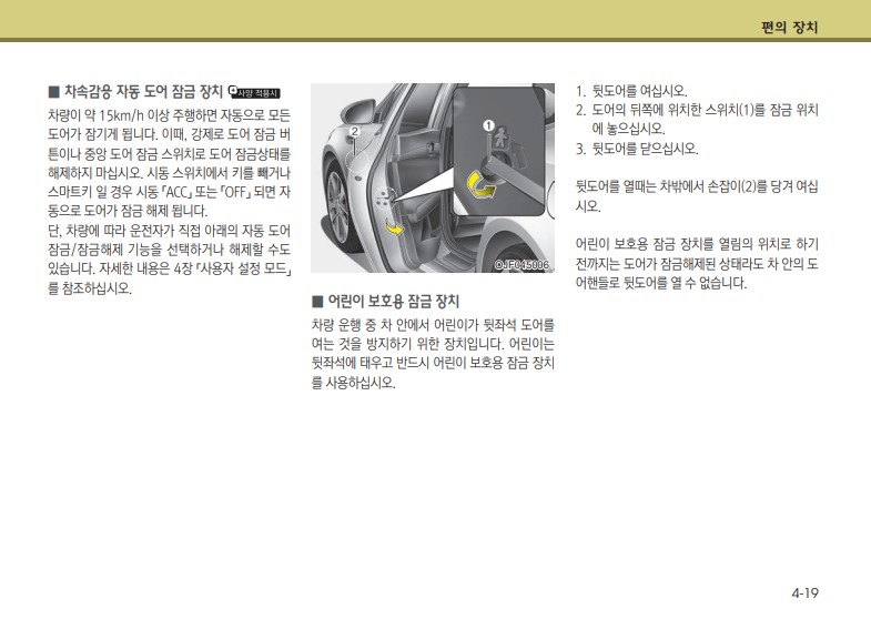 키 사용방법, 핸들 사용 및 위치 조절 방법, 엔진후드 여는법 등과 같이 자동차의 기능들을 작동하는데 알아두면 편한 사용 설명에 대한 내용이다. 사진과 같이 주행중 어린이가 차 문을 열지 못하게 할 수 있는 잠금장치 사용방법이나, LCD 표시창에 뜨는 경고 메시지 종류와 같은 내용들은 미리 숙지해두고 평소에 사용하면 좋을 것 같다.