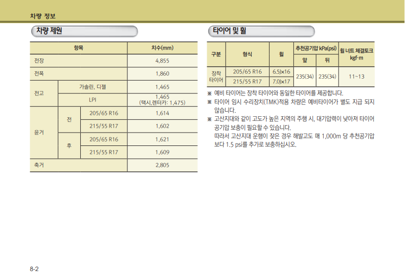 마지막으로 차량에 대한 정보들을 알 수 있는 항목이다. 차량 제원, 사용 타이어 규격, 사용 전구 형식에 대한 내용까지 알 수 있다.