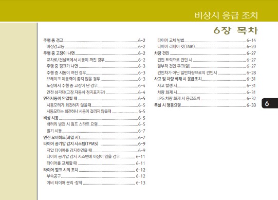 어쩌면 취급 설명서가 제일 생각나는 순간이 갑작스런 문제가 생겼을 때일 것이다. 위의 목차와 같이 시동이 안걸릴때, 타이어 리페어 킷을 사용 하는 매뉴얼, 견인을 해야 할 경우 등 여러가지 발생할 수 있는 비상상황에 대해 설명 되어져 있다.