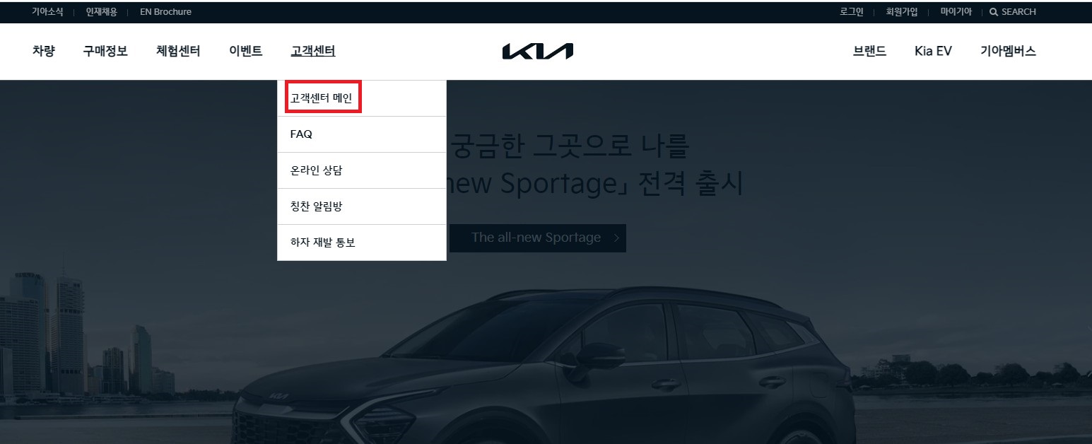 홈페이지에서 상단에 고객센터 ->고객센터 메인 메뉴로 클릭해 들어간다.