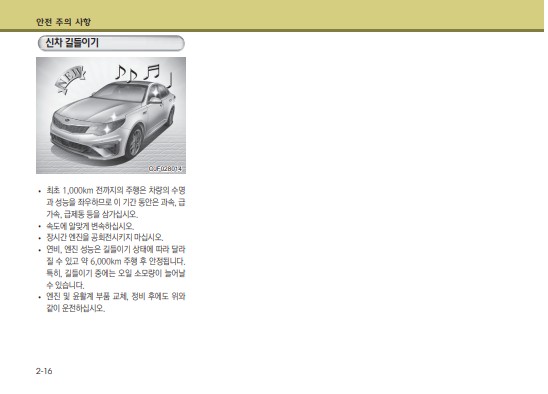 자동차 이용시 지켜야할 안전 사항에 대한 내용이다. 당연한거 아닌가 라고 생각할 수도 있는 부분이지만 익숙하고 당연한거야말로 놓치기 쉽기때문에 상기시켜보면 좋을 듯하다. 내용 마지막에는 신차 길들이기에 대한 내용도 나와있다. 최초 1,000km 전까지의 주행이 차량의 수명과 성능을 좌우한다고 한다. 또 연비, 엔진 성능은 신차 길들이기 상태에 따라 달라지며 약 6,000km 주행 후부터 안정된다고 한다.