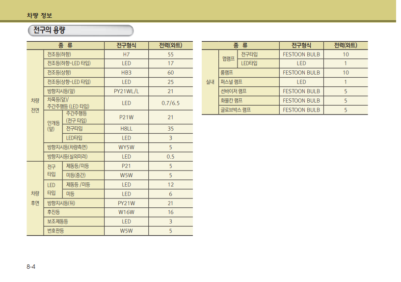 마지막으로 차량에 대한 정보들을 알 수 있는 항목이다. 차량 제원, 사용 타이어 규격, 사용 전구 형식에 대한 내용까지 알 수 있다.