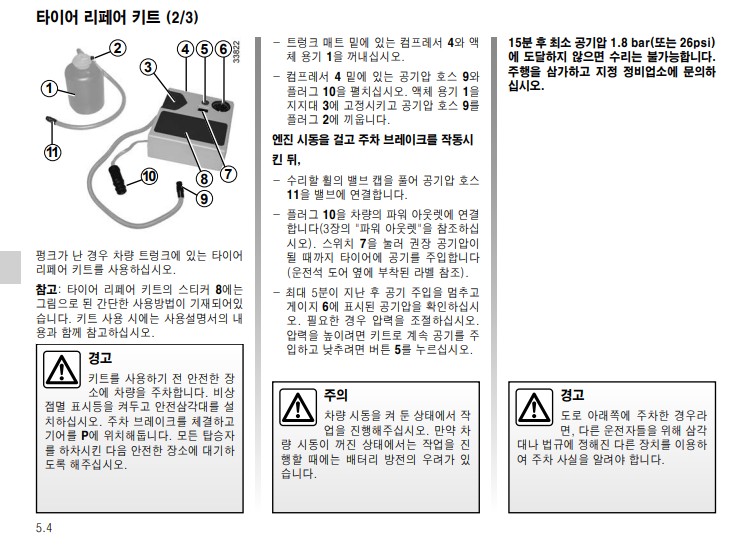 정기점검에 이어 간단한 문제는 운전자가 빠르게 직접 정비 할 수 있도록 설명하고 있는 항목이다. 타이어 리페어 키트나 공구 키트를 사용하는 방법, 차량의 전구를 교환하는 방법등이 이미지와 함께 설명 되어있고,