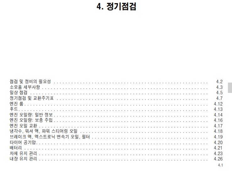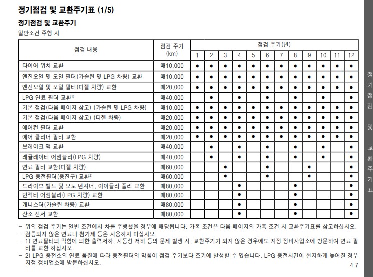 그래서 정기 점검 항목에서는 자동차 점검 및 정비의 필요성에 대해 설명하고, 점검을 해야 할 항목을 보기 쉽게 표로 나눠 점검내용과 점검 주기를 정리해 놨다.