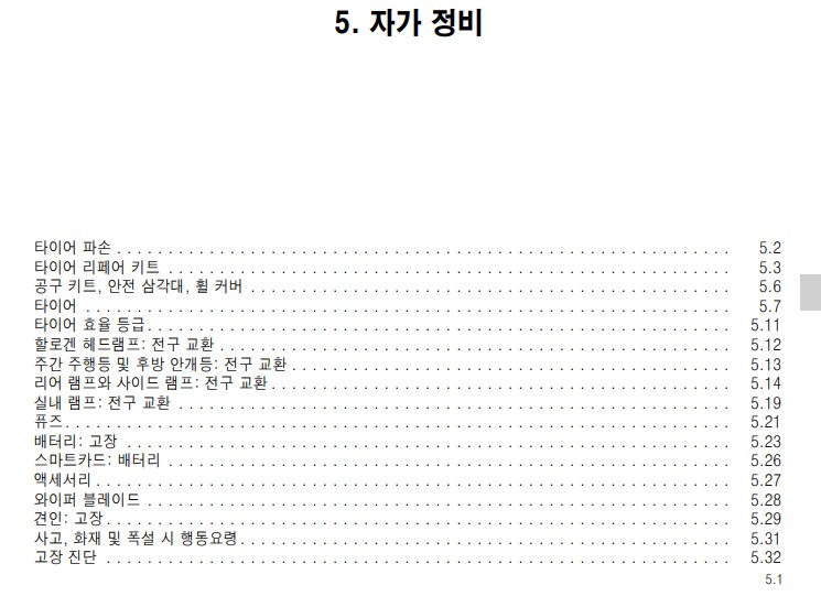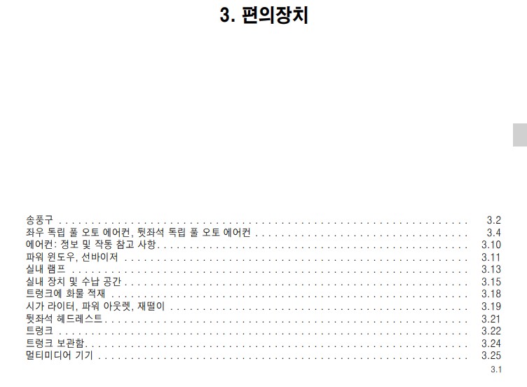 위의 목차와 같이 차량을 이용하는데 필요한 장치 및 자동차 기능에 대한 설명이 정리 되어있다. 스마트키를 사용하는 간단한 설명부터 좌석 통풍 시트 사용 법이나 스티어링 휠 조작법과 같은 자동차 기능적인 설명들이 있어 읽어보면 도움이 된다. 또 어린이 안전 시트 설치, 안전벨트, 에어백 작동과 같은 안전 장치에 대한 설명은 꼭 미리 숙지 해 둘 것을 추천한다.