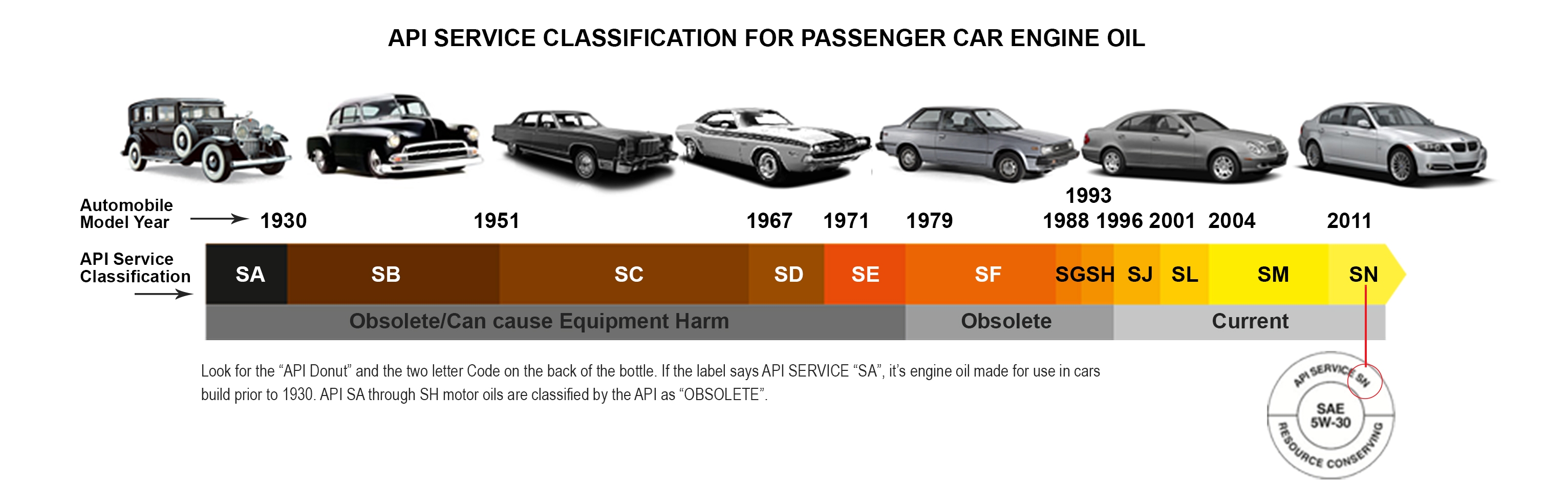 예를들어 가솔린 오일의 첫 등급은 SA였으나 SA부터 SH의 등급은 이제 폐기 되었고, SJ, SL, SM, SN 등급이 차례대로 뒤이어 생긴 등급으로 현재 시행중인 등급이다. 만약 엔진오일 추천 등급에 ‘API 최신 등급’이라고 되어있으며 SN등급을 사용하면 된다.