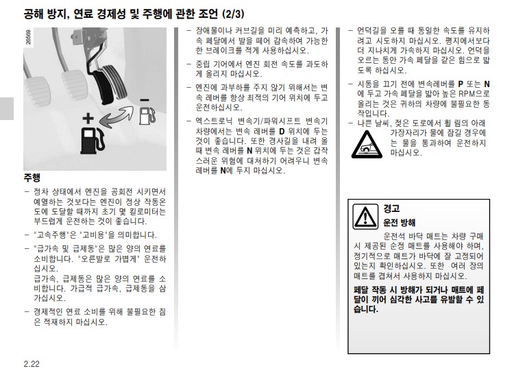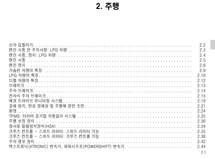 또 공해를 방지하고, 연료 소비를 아낄 수 있는 주행 방법에 대한 설명과, 주행 보조 기능에 대한 내용과 같이 실용적이고 활용도가 높은 차량관리 정보가 많은 항목이다.