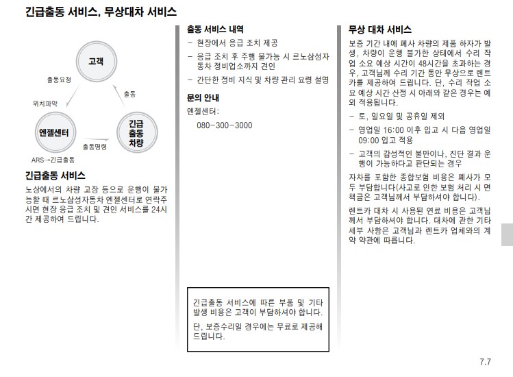 마지막으로 차량의 정보와 르노삼성에서 제공하고 있는 서비스 제도에 대해 확인할 수 있는 항목이다. 차량 정보 항목에서는 차량의 차대번호나 차의 크기인 제원에 대해 정보를 확인할 수 있고, 서비스 제도 항목에는 보증수리, 긴급출동 서비스 등과 같은 혜택에 대해 설명하고 있어 미리 알고 있으면 문제 발생시 도움이 될 것 같다.