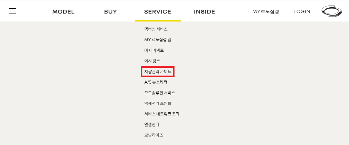 상단 메뉴중 SERVICE 메뉴를 열면 나오는 항목 중 ‘차량관리 가이드’를 클릭한다.