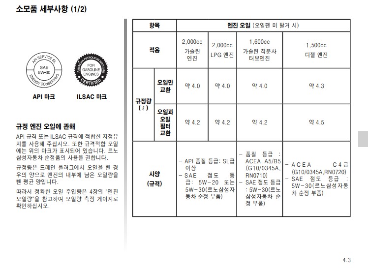 그리고 자동차 점검 외에 취급 설명서를 꼭 확인해야 하는 이유중 하나가 여기서 설명하고 있는 소모품에 대한 정보이다. 차량관리시 연료 외에도 엔진오일, 냉각수등의 소모품을 계속해서 보충해 줘야 하는데 그중에서도 엔엔진오일 구매할 때 어떤걸 넣어야 할지 모를정도로 너무 다양한 종류의 엔진오일이 있다. 현재 이 취급설명서를 보면 각 엔진별로 넣어야 하는 오일의 규정량과 규격에 대해 나와있다. 여기서 엔진오일 추천 사항에 적혀 있는 단어들이 뭘 뜻하는지 잠깐 짚고 넘어가보자.