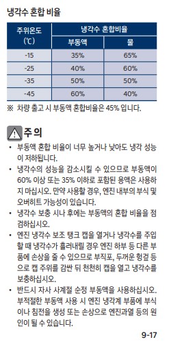 냉각수를 채울때는 부동액/냉각수 과 물을 혼합해야 하는데, 차량 취급설명서와 제품을 보면 혼합비율이 표시 되어 있어 꼭 확인을 하고 넣어주면 되며, 이 비율과 총 냉각수 보충 양을 참고해서 제품을 구입하면 도움이 된다.