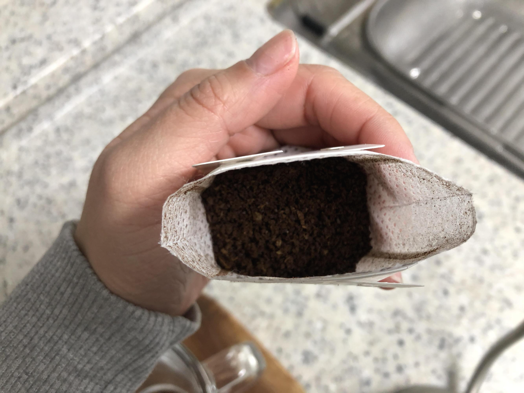 드립백 상단에 OPEN HERE라고 표시된 부분을 따라 입구를 뜯어내면 드립백에 담긴 원두가 보인다.