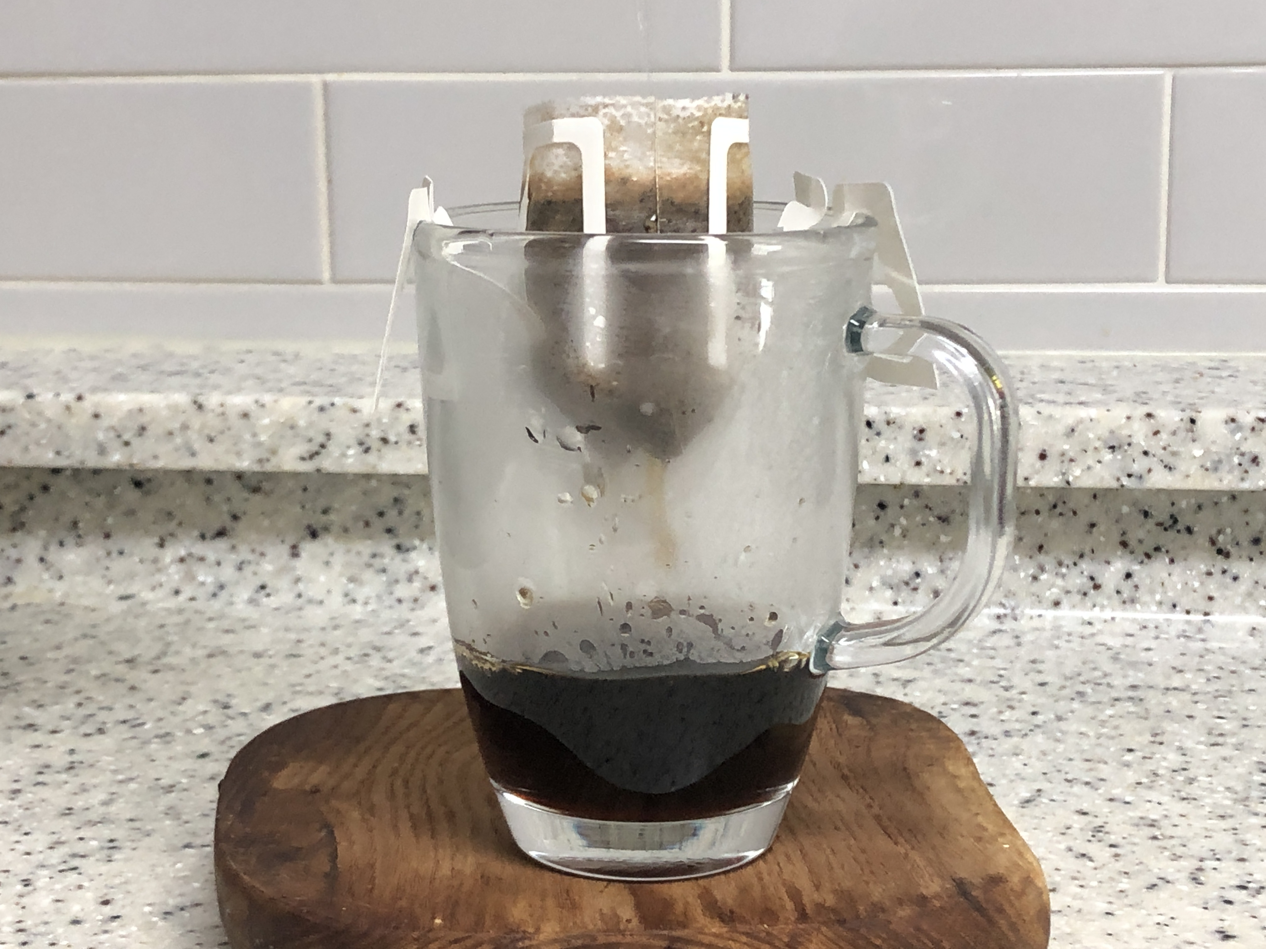 일회용 드립커피에 원하는 진하기에 따라 물을 조절해서 부워 우려내면 끝이다.