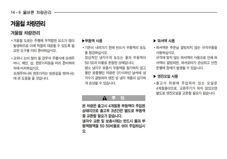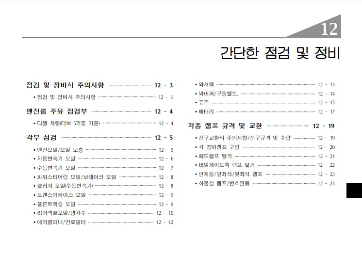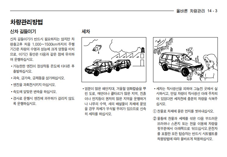 신차 길들이기부터 자동차의 외부, 내부를 손질하는 자동차관리법 들이 정리되어있고, 겨울철 관리 요령 및 주차 요령이 설명 되어있는 항목으로 차량의 사용 정도에 따라, 외부 환경에 따라 자동차관리법이 달라지기 때문에 이런 팁들을 참고하면 좋을 것 가다.
