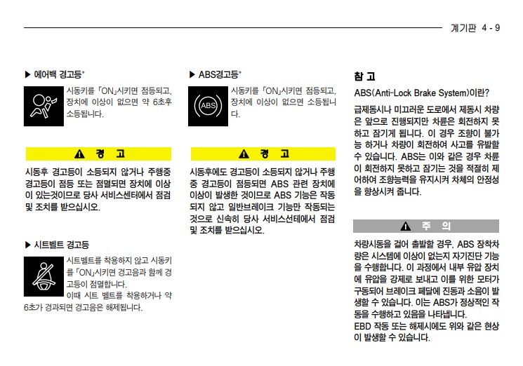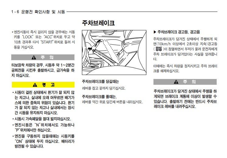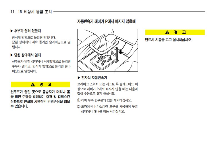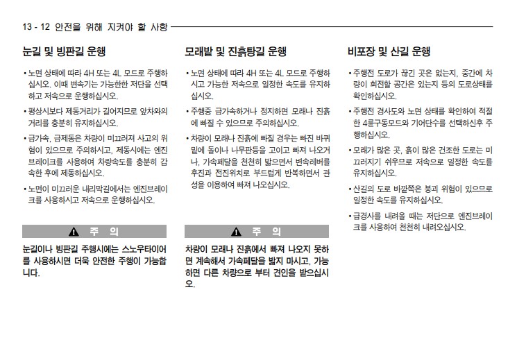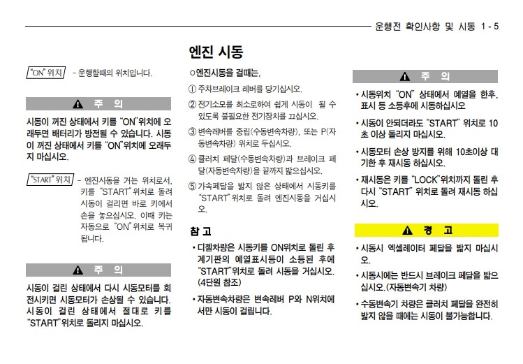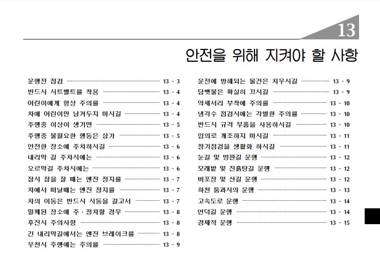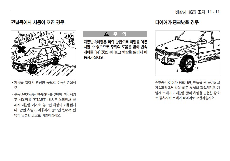 이 항목에서는 ‘주행중 충전 경고등이 점등되면’, ‘건널목에서 시동이 꺼진 경우’와 같이 비상상황의 경우를 제시하고 이런 상황에서 어떻게 대처해야하는지, 경고 및 주의사항은 어떤 것이 있는지 설명해 주고 있다.