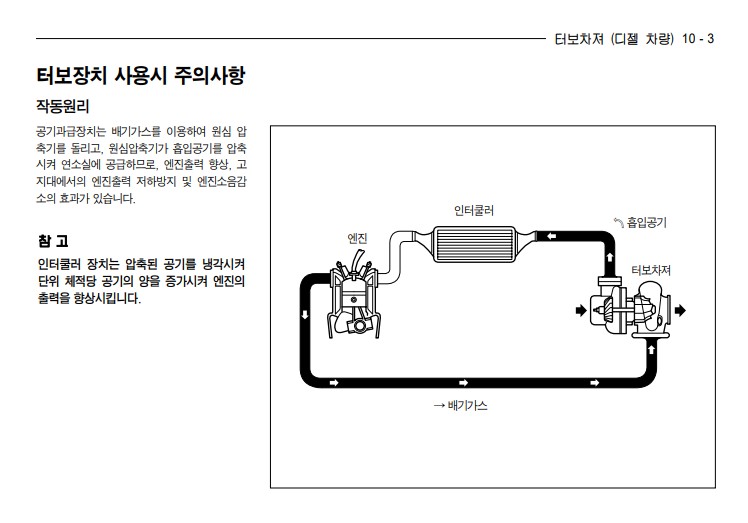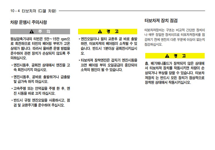 디젤 차량의 경우 확인 해야 할 항목으로 터보장치의 작동원리와 주의 사항, 경고사항 및 자동차 점검 방법에 대해 설명 되어있다.