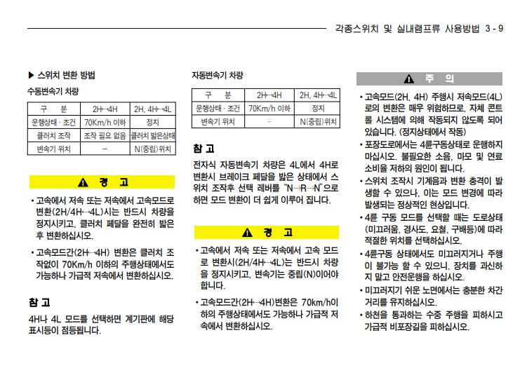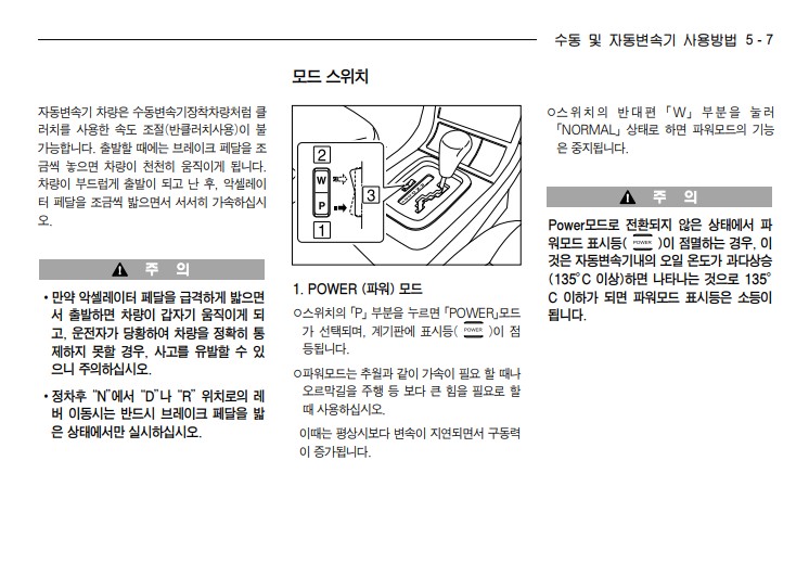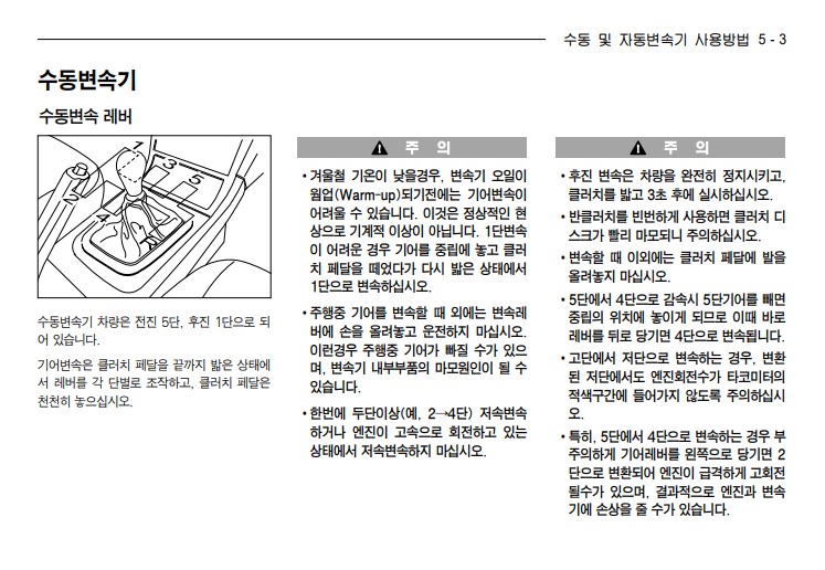 수동변속기와 자동변속기 이용방법, 주의사항에 대해 설명 되어있다. 변속기 이용시 발생할 수 있는 현상들이나 경고사항들은 미리 숙지 해두면 주행시 운전자의 편의성이 높아질 것 같다.