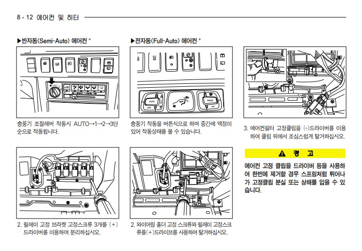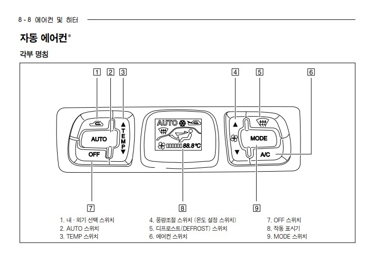 또 에어컨 및 히터 항목에서는 냉난방 장치를 조절하는 법과 자동,반자동 에어컨 작동법, 필터 교체 방법 등이 설명 되어 있어 처음 이용시에 작동방법 및 버튼 위치, 모양등을 숙지해두면 좋다.