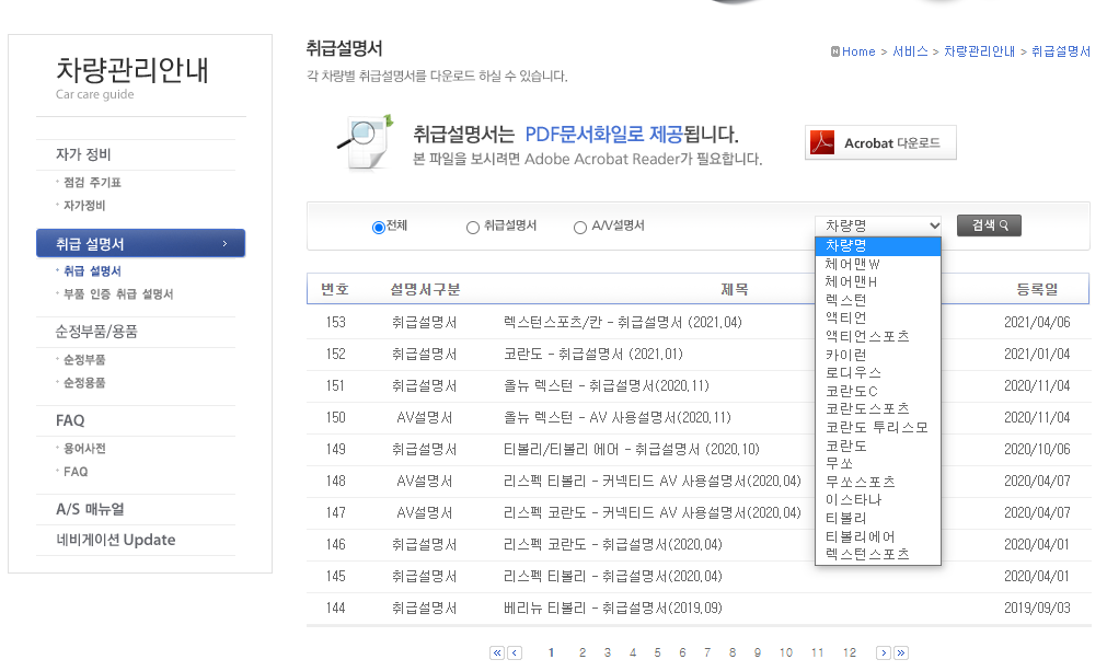 이제 새로 열린 페이지에서 원하는 차량 모델을 선택한 후 해당 취급 설명서 목록을 클릭해 들어가면 항목별로 다운로드 받을 수 있는 페이지가 새로 열린다.