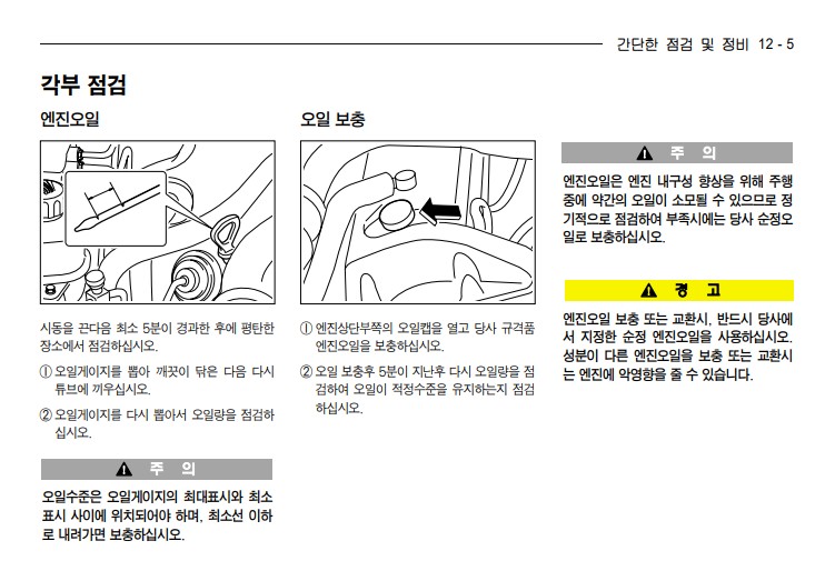 또, 취급설명서의 가장 중요하고, 많이 필요로 하는 정보중 하나가 엔진오일 추천 및 소모품에 대한 규격일 것이다. 이 표를 참고로 용량과 엔진오일 추천 규격을 확인하면 된다.