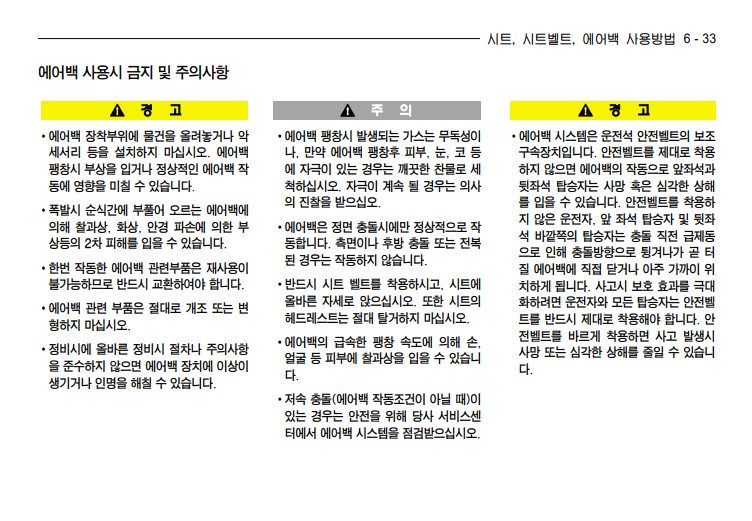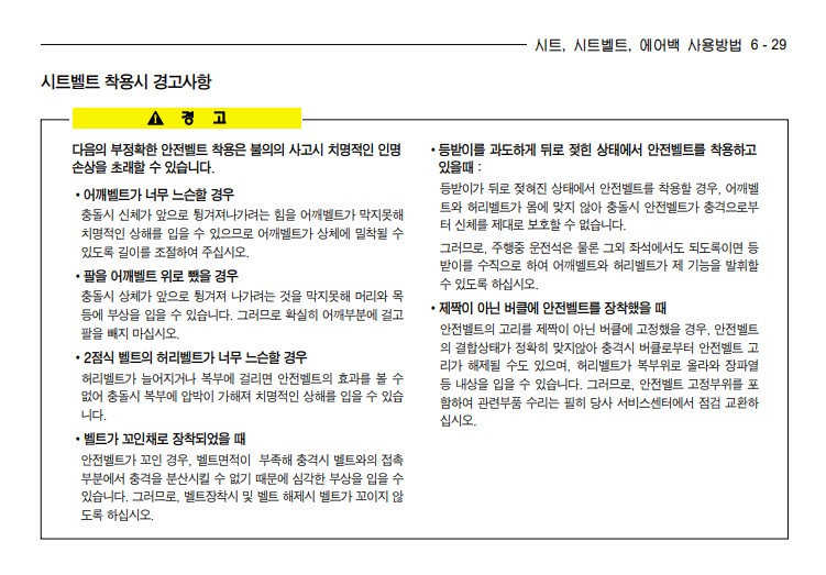 시트를 사용자에 맞게 조절하고, 이용하는 방법과 시트벨트 이용방법 그리고 에어백에 대한 내용이 정리 되어있다.