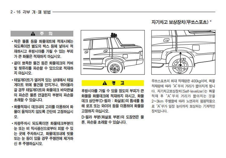 탑승할 수 있는 문 뿐만 아니라 테일게이트, 후드 등 열 수 있는 모든 문에 대한 설명이 정리 되어 있다.