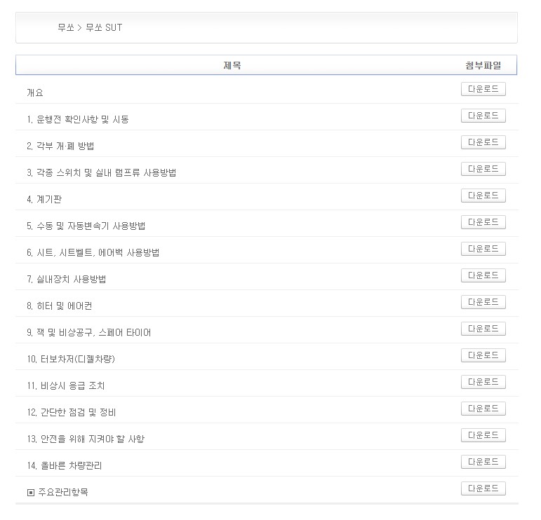 무쏘 SUT 모델의 취급설명서로 확인을 해 봤다. 설명서의 목차별로 원하는 항목만 확인해볼 수 있도록 각각 다운로드 할 수 있게 되어있다. 순서대로 각 항목에 어떤 내용이 있는지 간단하게 살펴봤다.