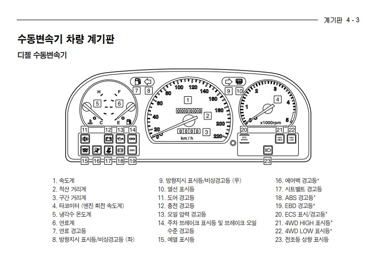 핸즈프리 사용 방법부터 2륜구동과 4륜구동을 전환하는 변환 스위치 사용 방법이나 눈길이나 진흙길 같은 상황의 도로에서 도움을 주는 차동제한장치(LSD), 주행조건 및 노면 상태에 따라 조절되는 ECS 장치 같은 자동차 기능의 설명도 정리 되어 있다.