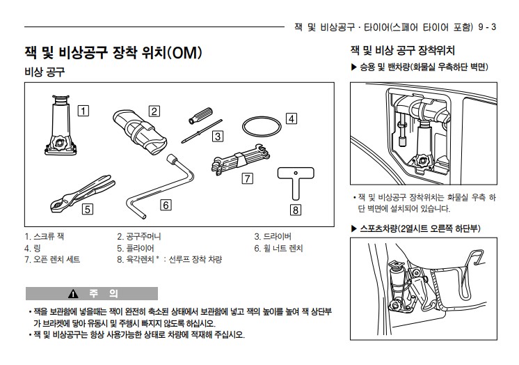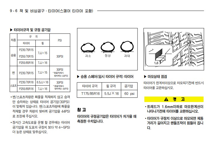 차량 내에 장착되어있는 차량 정비용 비상공구의 위치와 사용법에 대해 정리되어 있고, 타이어 규격 및 공기압, 마모상태 점검등과 같은 정보를 얻을 수 있다. 또 타이어 펑크 시 대처방법이나 스페어 타이어 교체 방법과 같은 정보는 꼭 미리 습득 해 두는 것이 좋다.