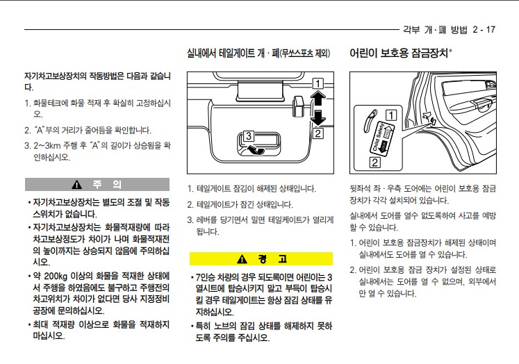 무거운 짐을 차량에 싣고 달리는 겨우 타이어와 차체의 공간이 좁아지는 것을 어느 정도 보완해주는 자기차고 보상장치나, 어린이가 실내에서 차문을 열지 못하게 하는 어린이 보호용 잠금장치 같은 자동차 기능은 미리 작동방법과 위치를 알아두면 좋다.