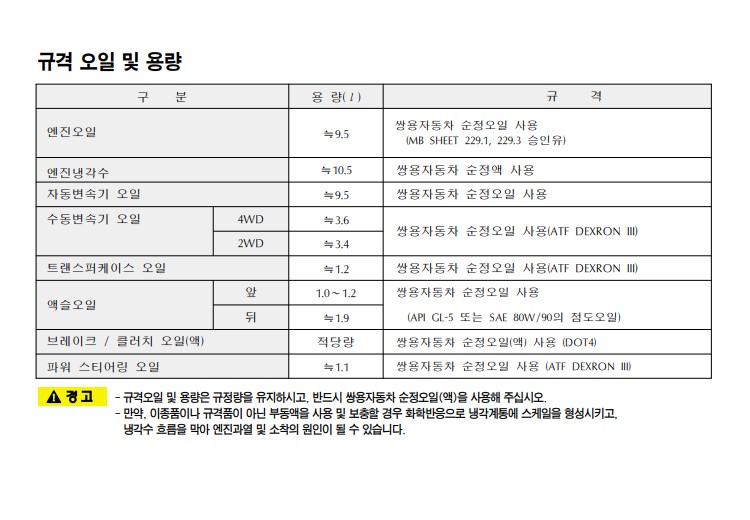 무쏘의 규격 오일 및 용량 내용을 확인해 보면 엔진오일 추천 사항에 쌍용자동차 순정오일(MB SHEET 229.1, 229.3 승인유)의 규격을 사용하고, 9.5L의 용량을 넣으면 된다고 적혀있다.
