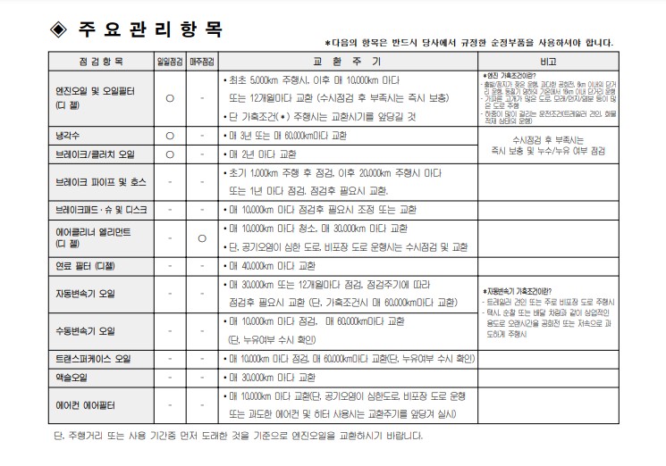 자동차 점검 및 관리시 점검와 교환 주기를 운전자가 한눈에 알아볼 수 있도록 정리한 표가 있는 항목으로, 교환주기를 놓치면 자동차 기능 및 성능이 떨어지고 위험할 수 있기 때문에 잊지 않고 관리하기 위해 참고하면 좋을 것 같다.