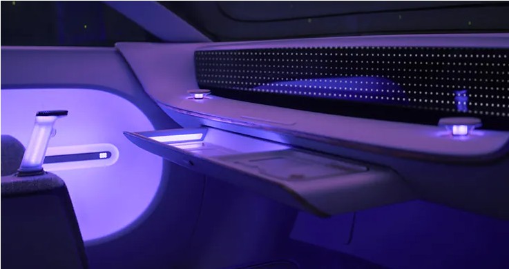 시트의 활용도도 이색적이다. 2개의 스위블링 라운지 체어는 180도 회전과 앞뒤 이동이 가능하며, 1개의 라운지 벤치 시트는 운전모드, 자율주행 모드 등 상황에 따라 자유롭게 배열 변형이 가능하다. 또 27인치 디스플레이가 장착된 이동식 콘솔인 ‘유니버셜 아일랜드’는 가전 제품처럼 디자인 되어 탑승자가 집처럼 아늑한 느낌으로 이용할 수 있도록 분위기를 조성한다. 또 77인친 비전루프 디스플레이, 슈즈 케어 공간 및 미니 냉장고 등이 더욱 쾌적한 실내 공간 이용을 하도록 도와준다.