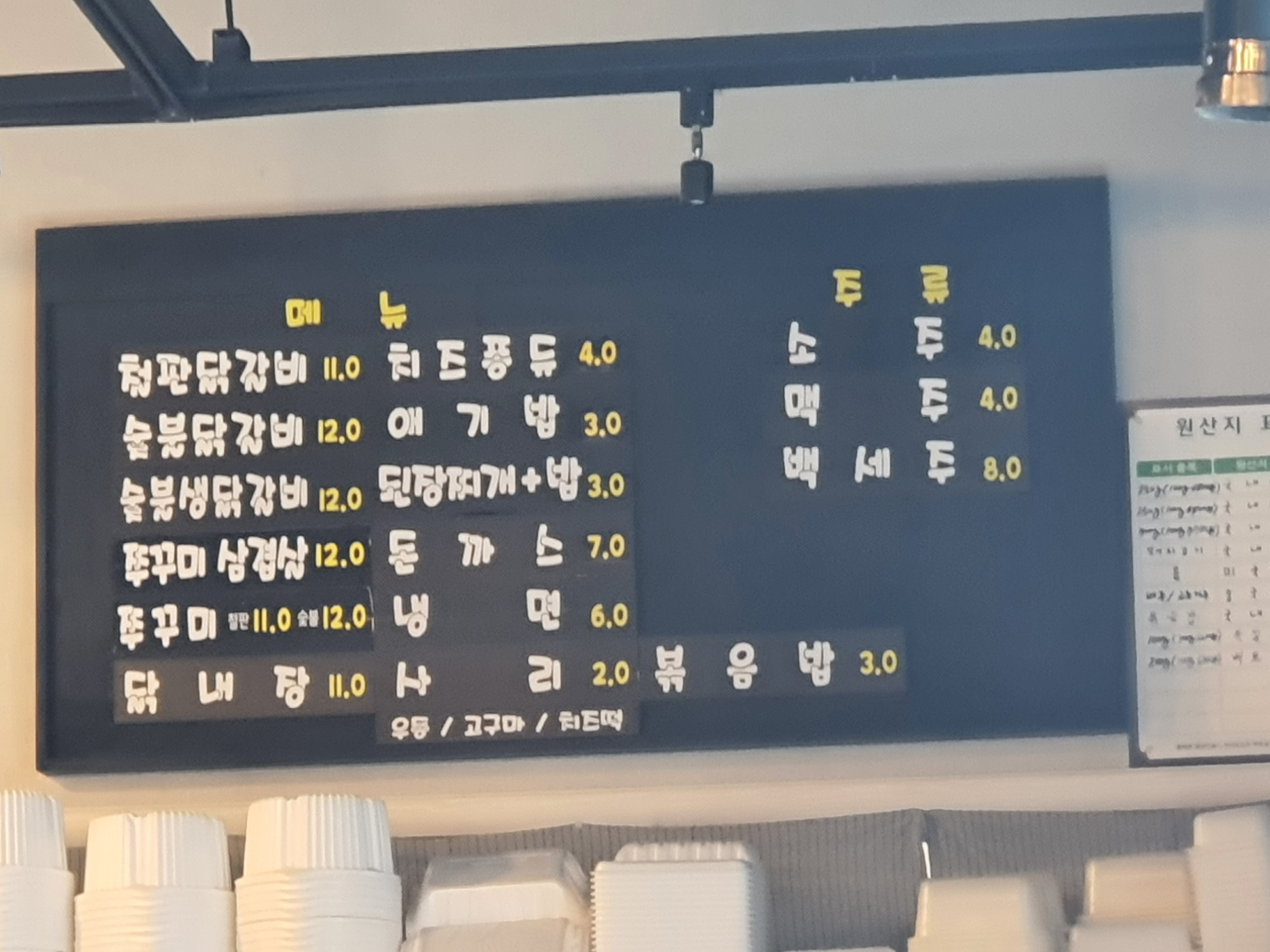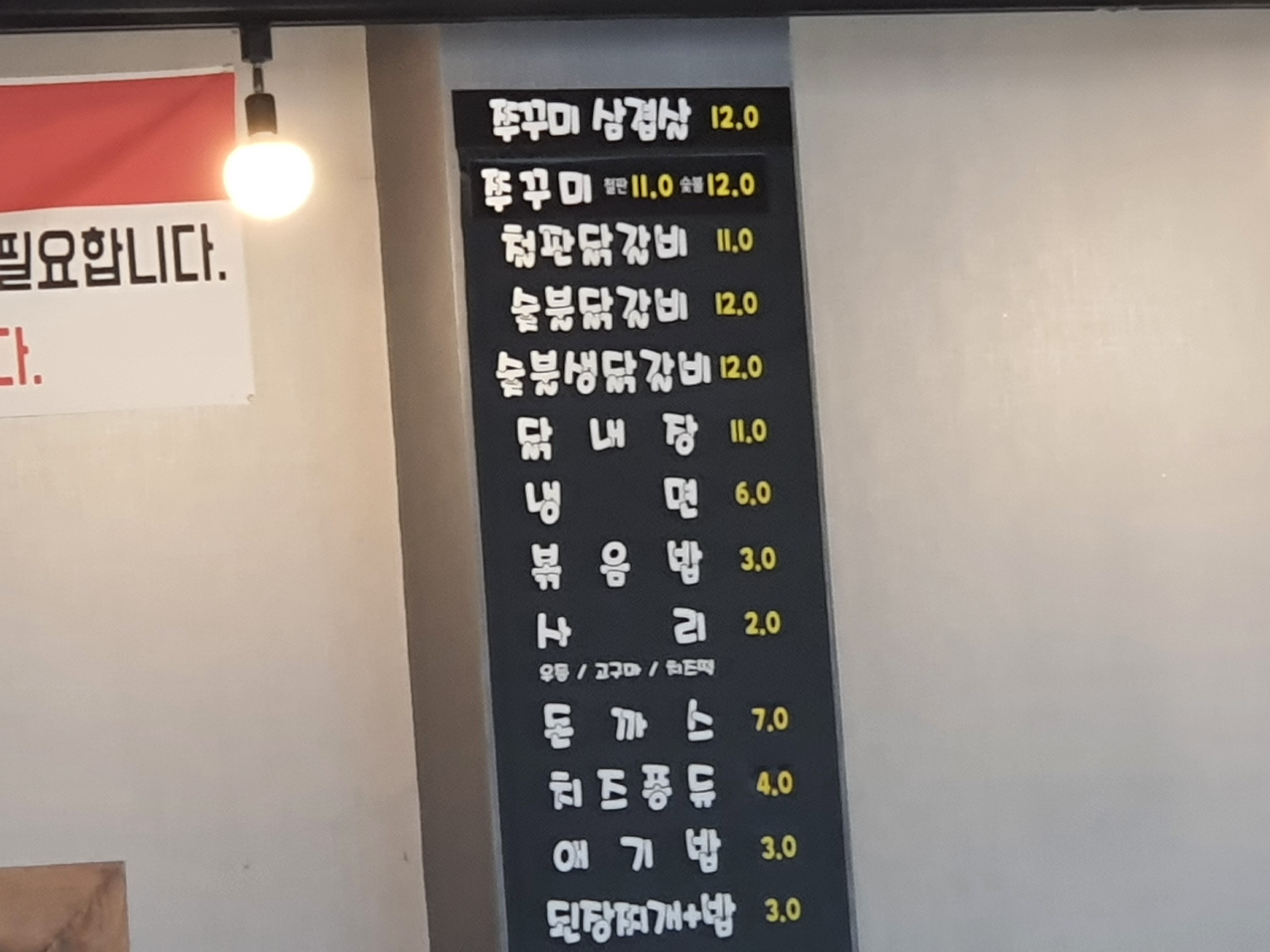 사실 비발디파크 근처 맛집이 아니여도 상관 없었다. 시간도 많았고 차도 있는데 뭐가 대수냐고 찾아온 이 곳은 점심시간을 살짝 지난 평일임에도 사람이 한산한 편이였다. 하지만 주말에는 주차할 곳을 찾는 것이 어려울 수 도 있기에 참고해야한다. 이 곳은 특이하게 철판 닭갈비와 숯불 닭갈비를 동시에 판매하고 있다. 내가 아는 닭갈비는 철판 아니면 숯불 둘 중 하나만 판매하는데 특이하게 이 곳은 쭈꾸미 삼겹살까지 판매하고 있어서 이 곳이 정말 맛집이 맞을까? 라는 의구심이 들기도 하는 곳이였다.