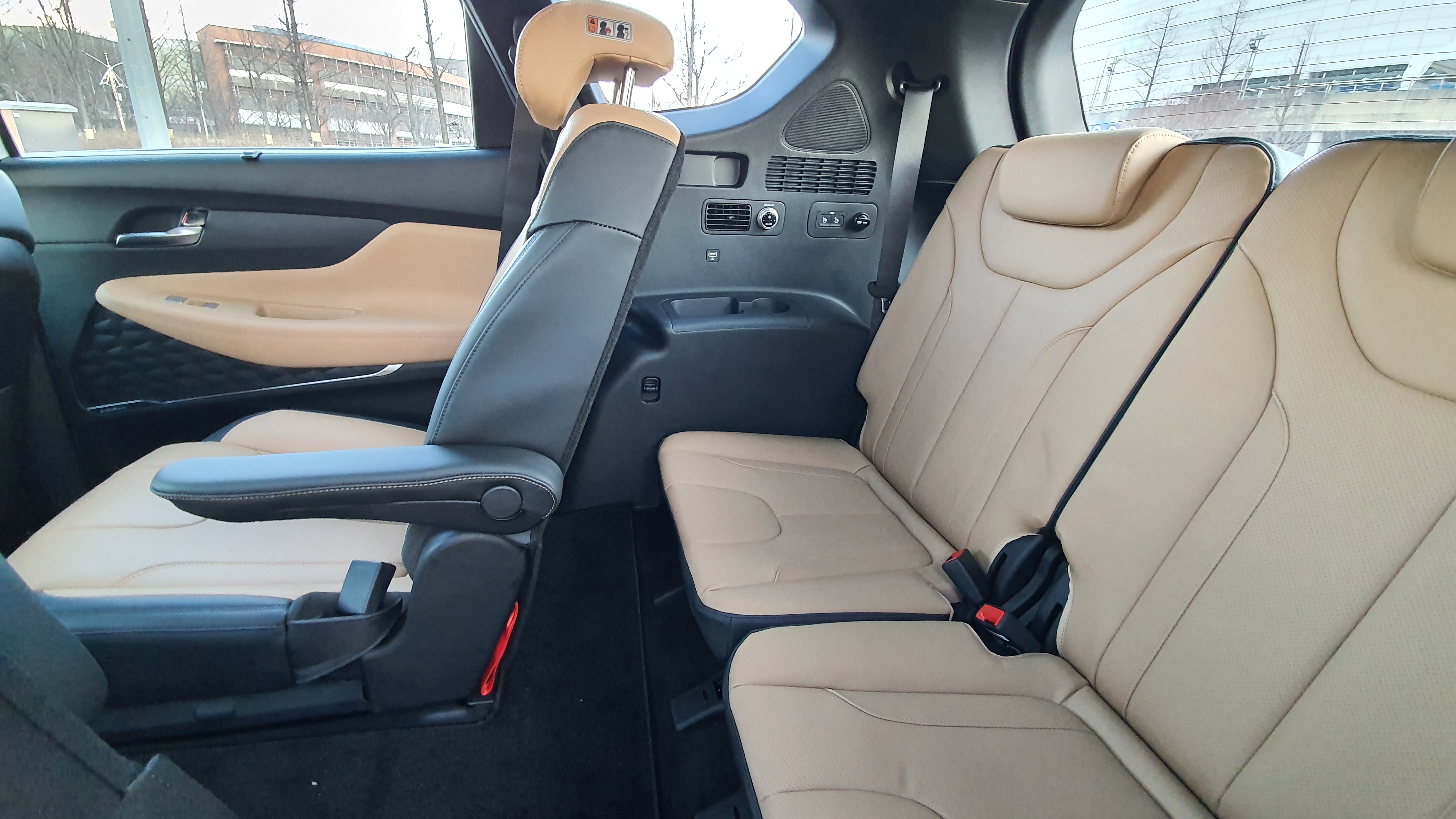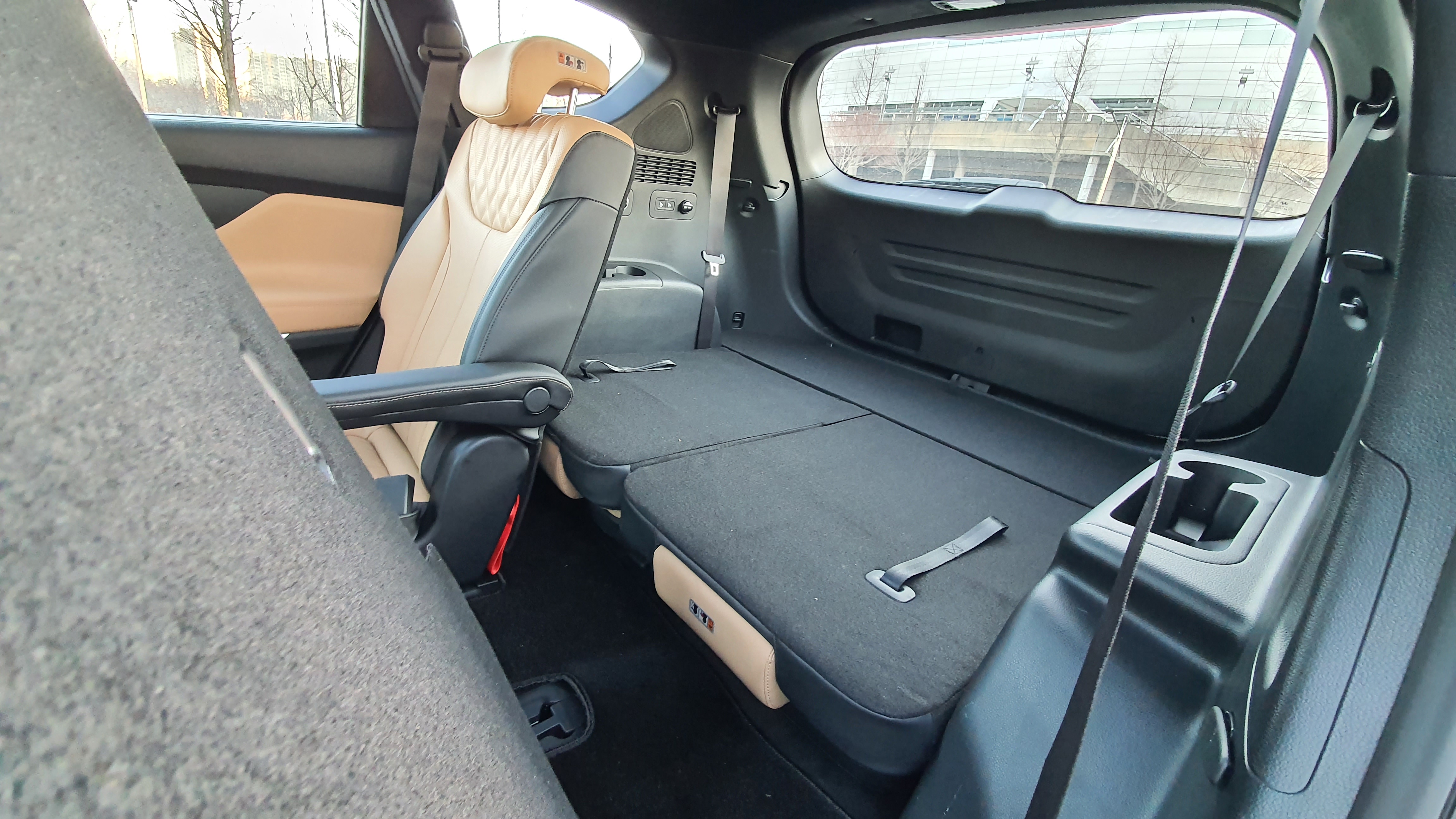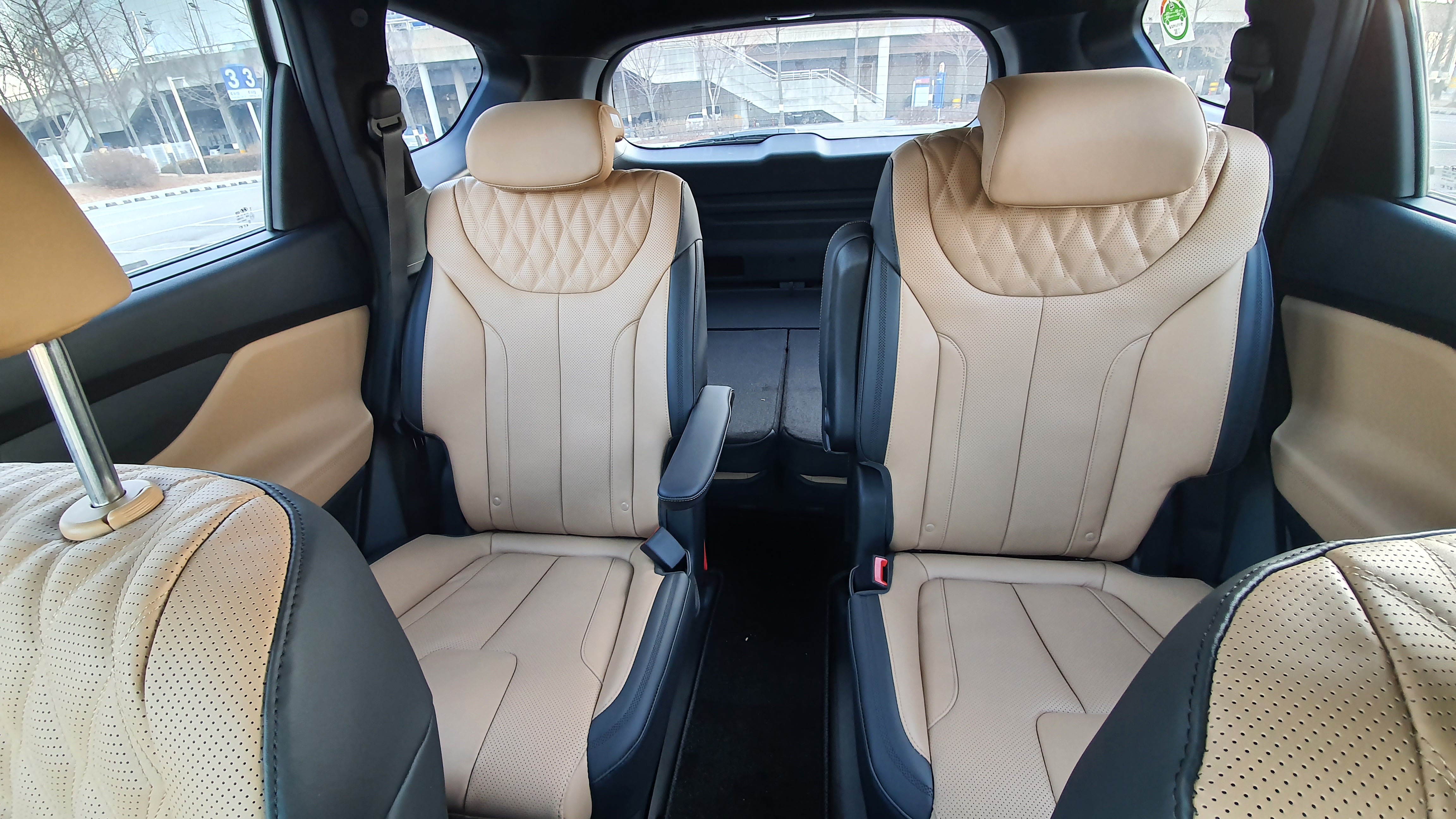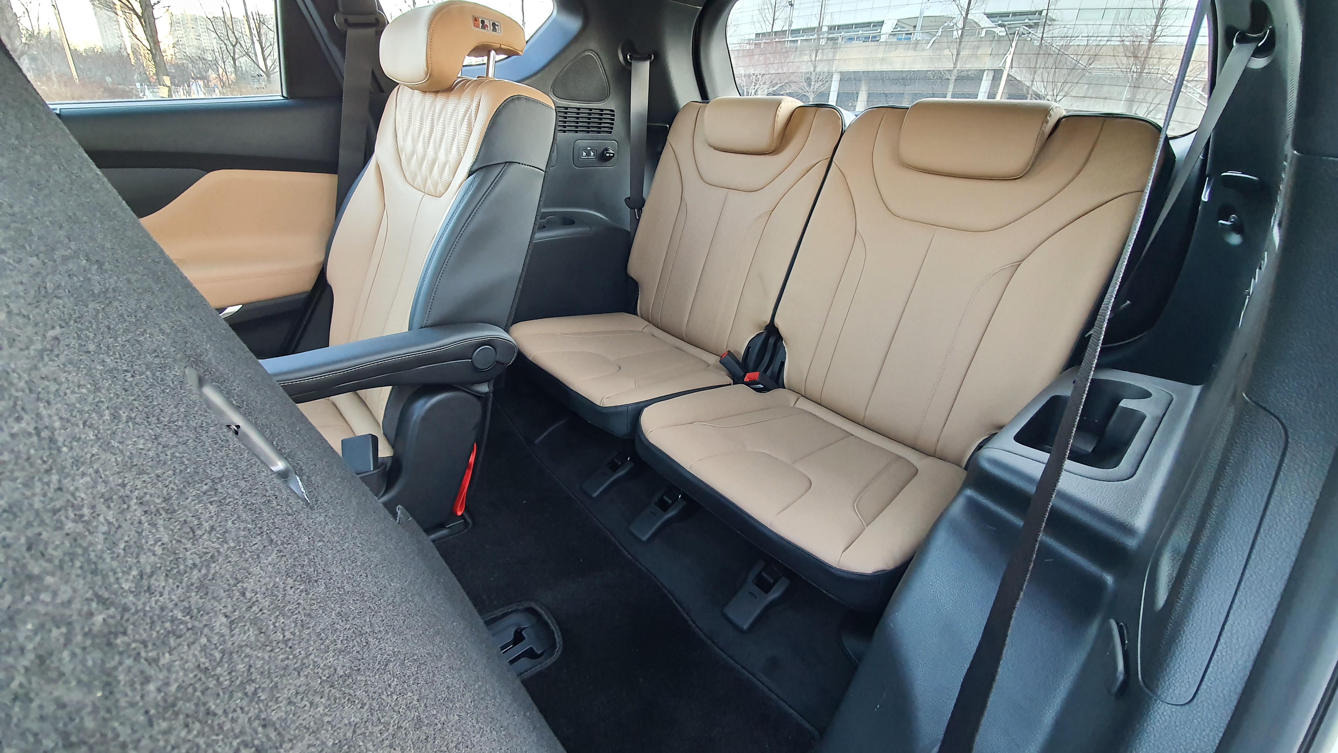 3열 시트는 솔직히 그렇게 편한 편은 아니다. 2열의 레그룸을 어느 정도 희생해야 3열 레드룸이 확보가 가능하다. 짧은 주행에서는 3열 공간이 크게 불편함은 없지만 장거리 주행에서는 다소 답답한 느낌을 보여주기도 한다. 하지만 3열 공간에 배려가 완전히 없는 것은 아니다. 3열 에어컨과 스마트 원터치 워크인 & 폴딩 시트가 적용되어 있으며 USB 충전 포트와 180W 시거잭이 기본으로 적용되어 있다. 2열 시트를 접을 때는 버튼을 한 번만 눌러서 접을 수 있다는 점도 3열에 대한 배려 중 하나이다.