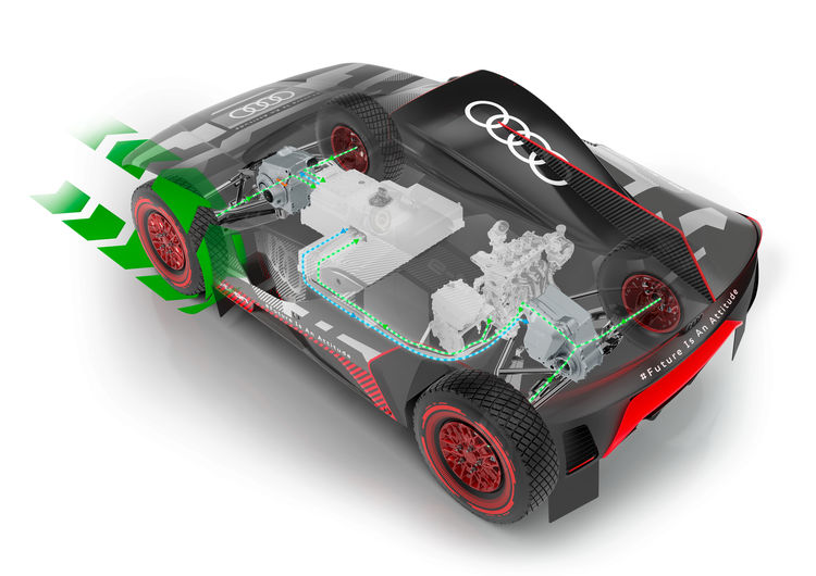 Audi가 8년동안 참가했던 레이스인 포뮬러 E가 올해를 끝으로 철수하면서 여기서 얻은 경험이나 기술을 이 차에 모두 쏟아 부었다고 할 수 있습니다. 그래서 이 차에는 포뮬러E에서 사용했던 강력한 전기모터와 고효율 모터 제너레이션 유닛이 들어갑니다. 출력은 671마력 정도고 앞, 뒤에 있는 전기 모터가 같이 구동해서 사막 지형에서 꽤 좋은 성능이 나올 것으로 기대 되고 있습니다.