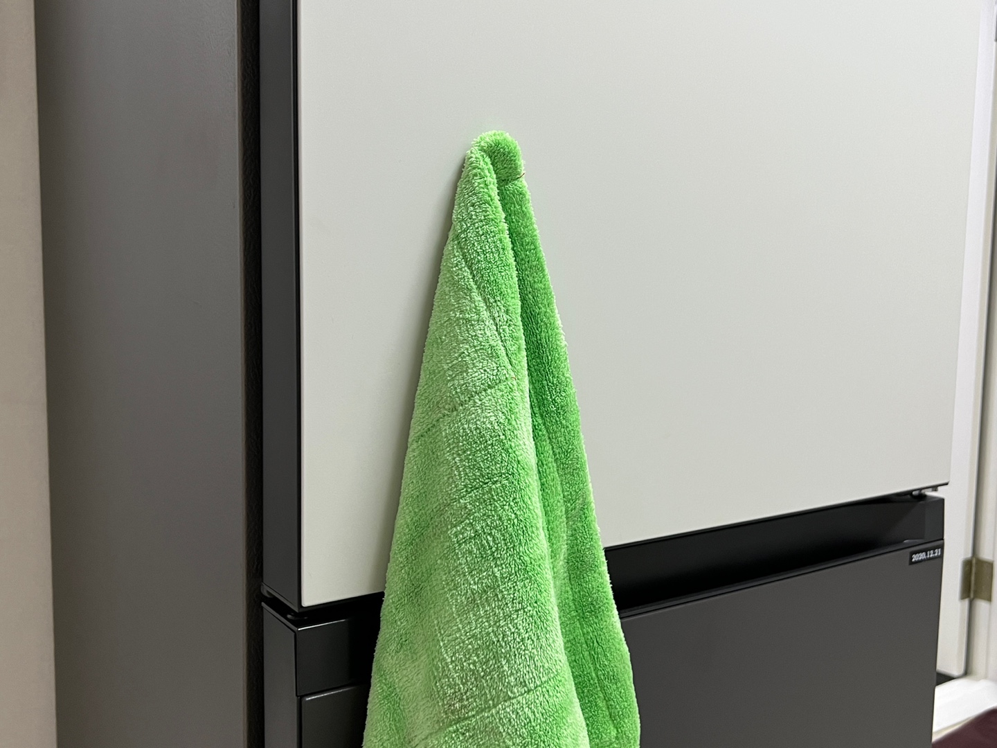 냉장고문을 닦을때 손잡이 윗쪽에 타월을 붙여 놓으면 손잡이로 물이 뚝뚝 떨어지는걸 방지 할 수 있습니다.