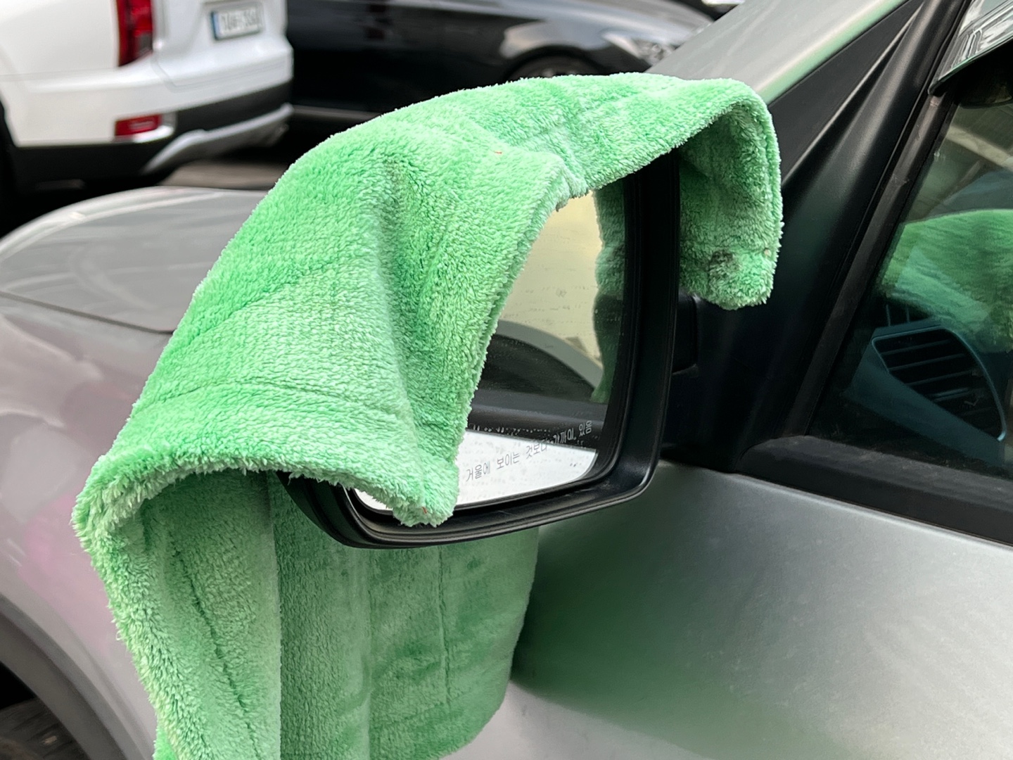 또는 물이 튀지 않길 원하는 곳이나, 물이 계속 떨어지는곳 부근에 드라잉타월용도로 부착해 두면 편리합니다. 예를들어 사진엔 대충걸쳐 놨지만 사이드 미러 안쪽을 감싸듯 타월끝끼리 자석을 붙여주면 물이 계속 떨어지는 것을 방지할 수 있습니다. 다른 예로 자동차 손잡이 같이 홈이 파져 있어 물이 계속 흐를 수 있는 곳 바로 밑에도 자석으로 타월을 붙여 고정해 두면 미처 닦지 못해 흐르는 물로 인해 계속 닦을 번거로움이 줄어 들게 되죠.